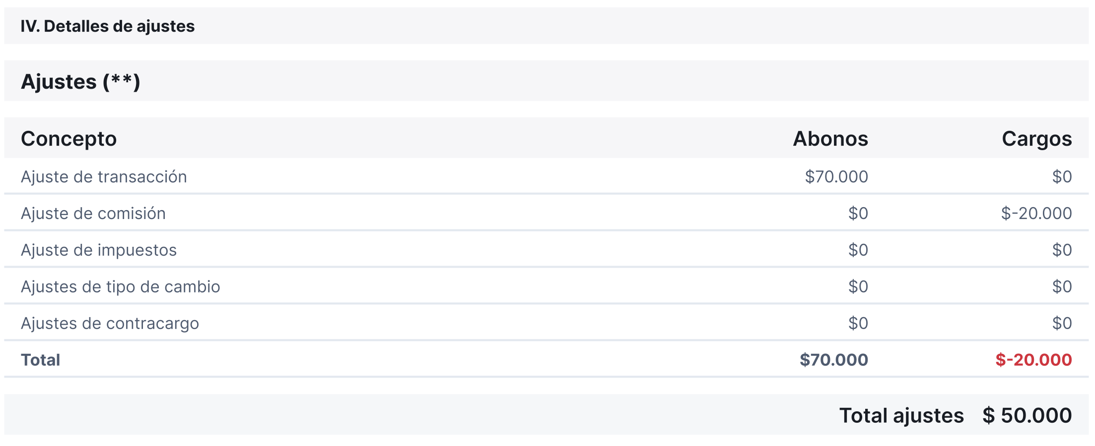 Aquí se muestra el desglose de los ajustes realizados durante el periodo. Estos pueden reflejarse como abonos o cargos, dependiendo del caso.