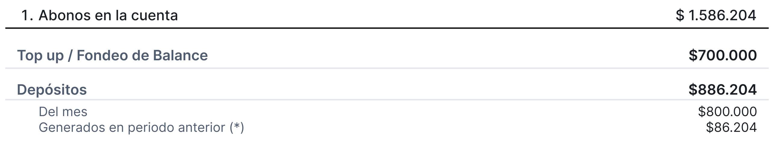 • Depósitos de meses anteriores: Transacciones creadas en el periodo previo y completadas en el periodo actual.