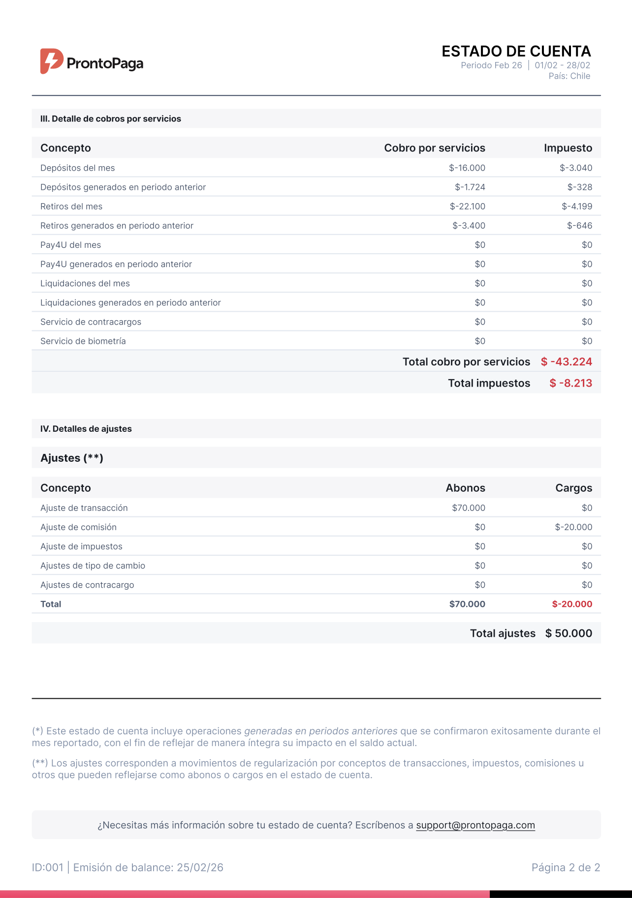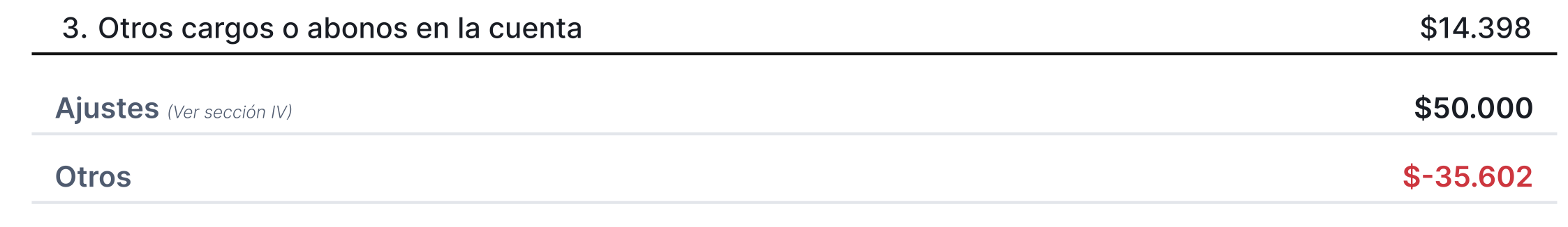 • Ajustes: Modificaciones realizadas durante el periodo, las cuales se detallan en la segunda página del estado de cuenta.
