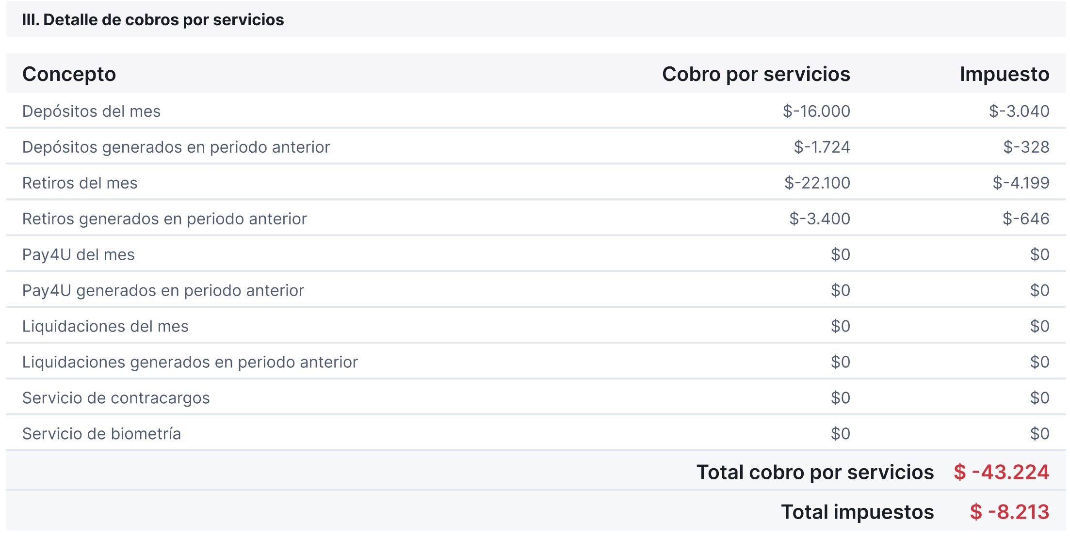 En esta sección se desglosan las comisiones cobradas por los servicios utilizados, junto a sus impuestos asociados.
