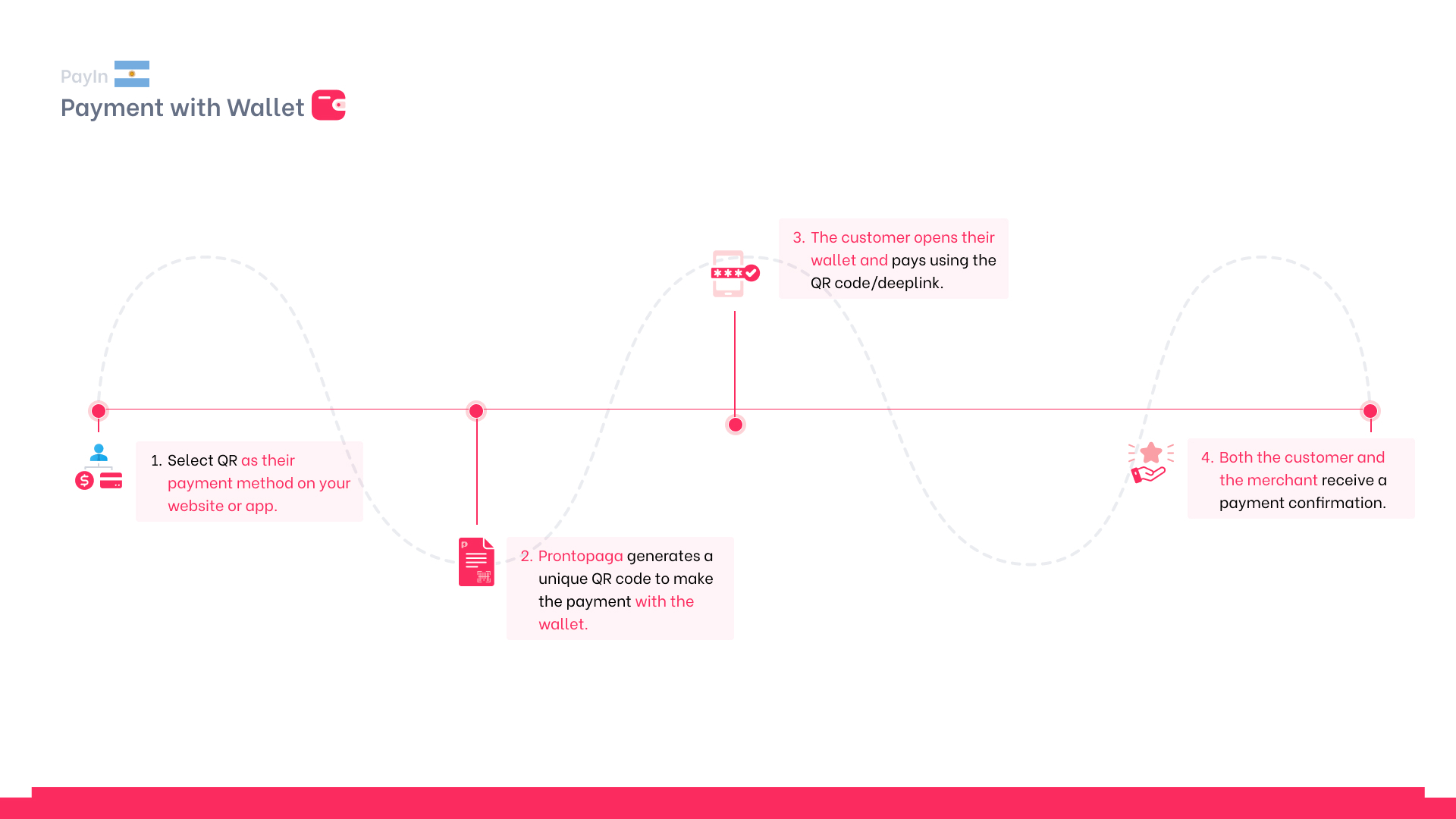 El proceso de pago con wallet en Argentina consta de cuatro etapas principales: