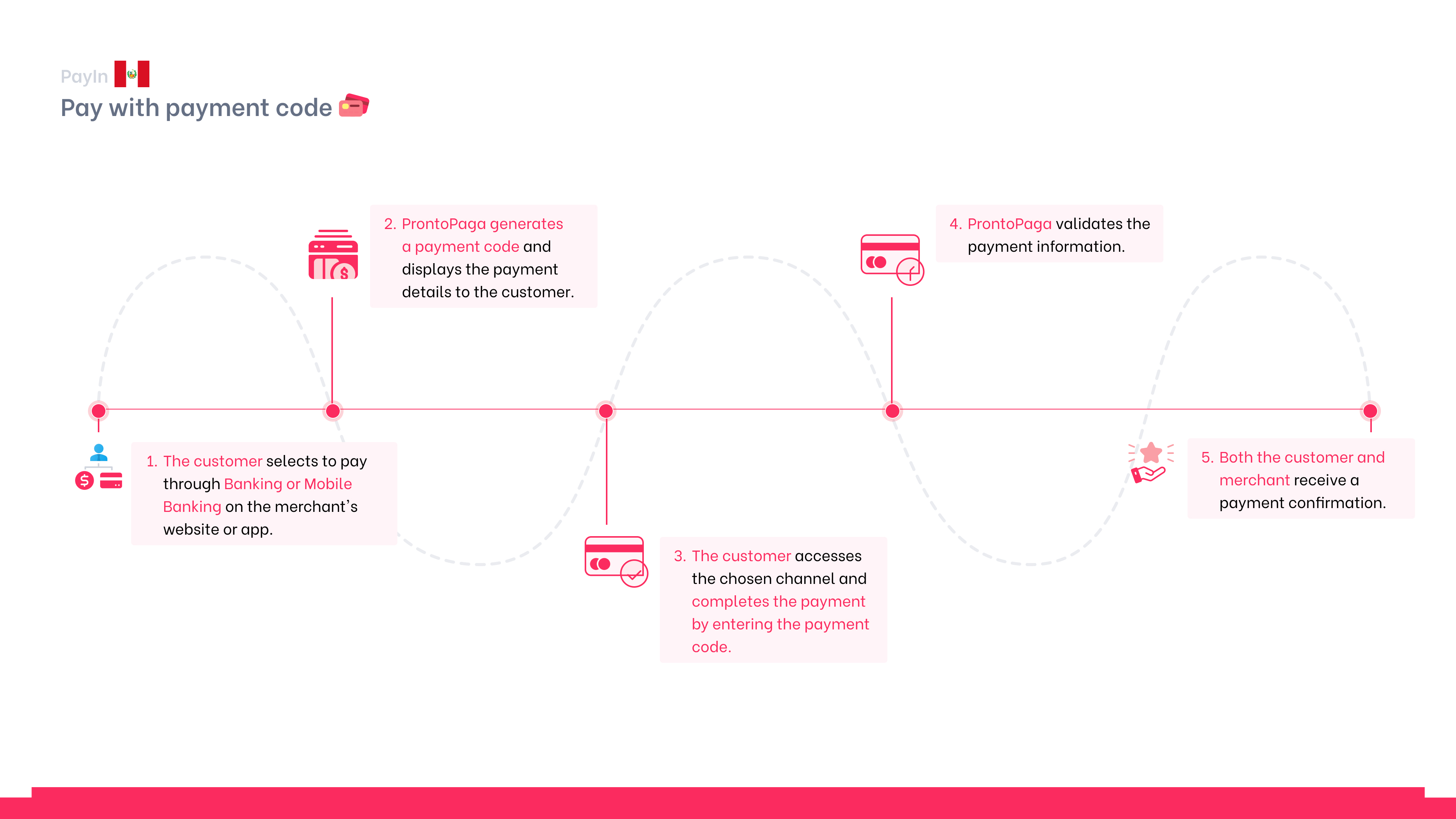El proceso de pago con código en Perú consta de cinco etapas principales: