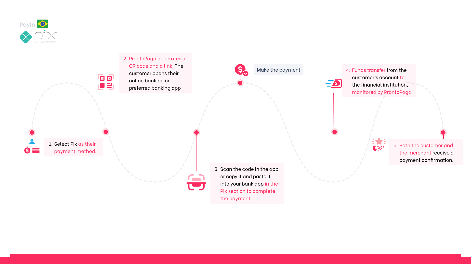Pix es un sistema de pagos instantáneos, creado y administrado por el Banco Central de Brasil, mediante el cual puedes realizar transacciones en tiempo real mediante códigos QR. Para completar una transacción con este método de pago, el cliente debe tener una cuenta bancaria o de una institución financiera en Brasil, registrarse en el sistema Pix y aprobar la transacción desde su aplicación.